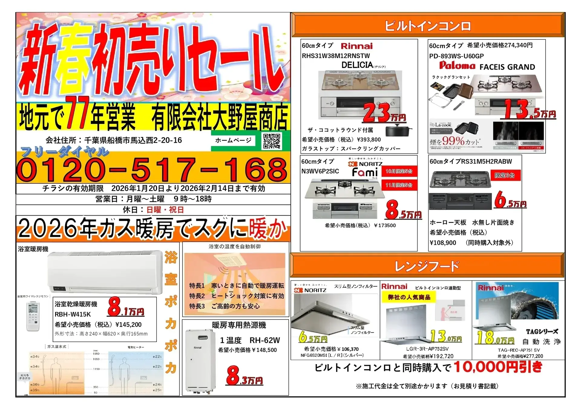 船橋市とその周辺で、お家のガス機器や水回りのトラブルに迅速対応する有限会社大野屋商店。創業75年を超える歴史と地域密着の対応で、販売から修理、施工、そしてアフターフォローまで一貫してサポートします。